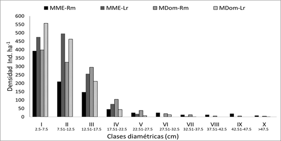 Estructura. A partir de datos de DAP, y de acuerdo con Corella et al., (2004), se definieron 10 categorías diamétricas (5 cm de amplitud). Para medir la altura se consideraron seis clases con amplitud de 5 m, incluyendo árboles a partir de 2 m de altura. En el sotobosque y la vegetación de altura baja (< 1.8 m), la caracterización de los estratos arbustivo y herbáceo se realizó en los subsitios establecidos, midiéndose aspectos como altura y DN.