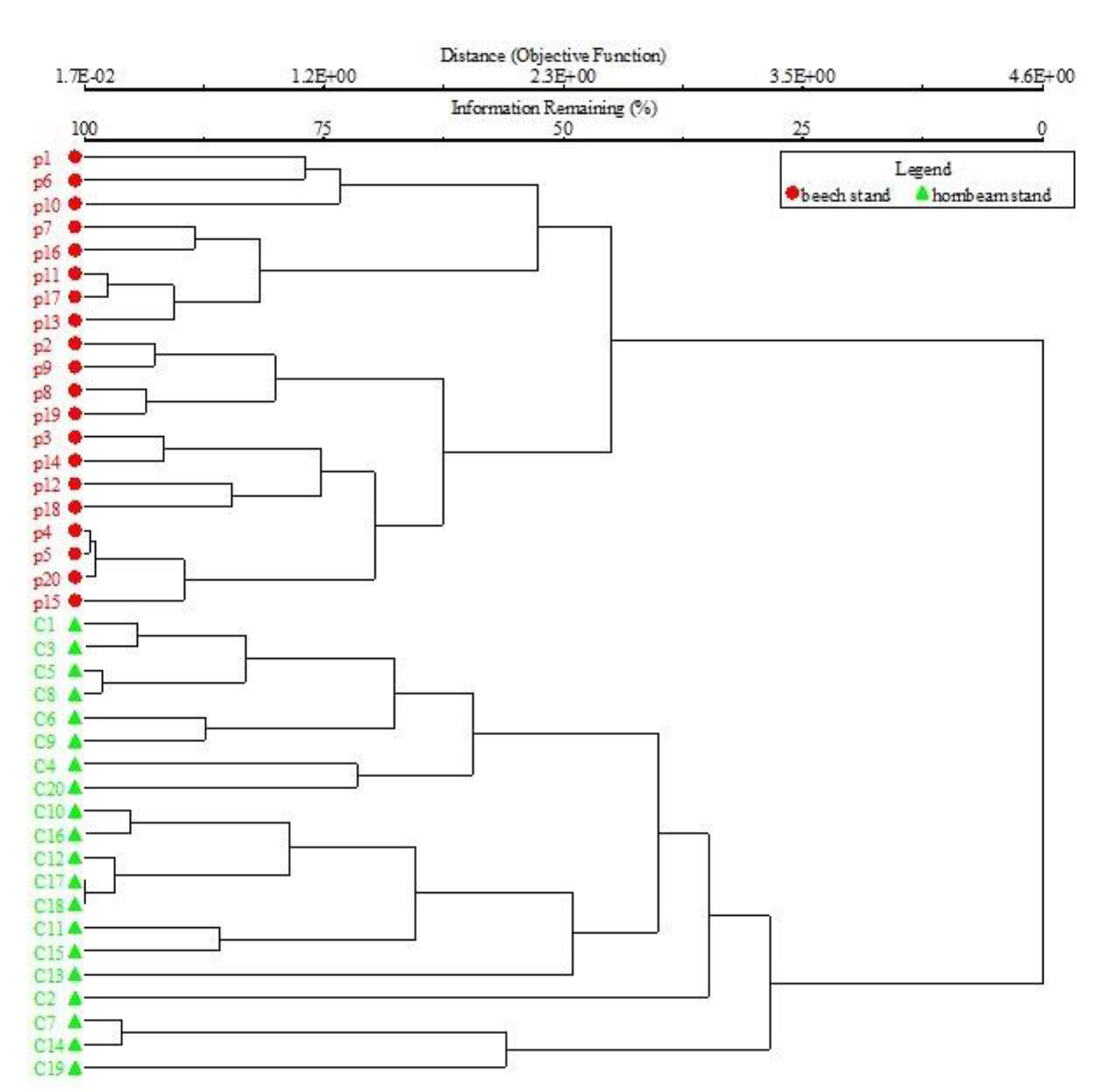 According to the diagram of cluster analysis, there are two distinct groups (Fig. 2). A total of 20 sampled plots of the mixed beech stand were considered as the first group and 20 sampled plots of the mixed hornbeam stand were regarded as the second group.
