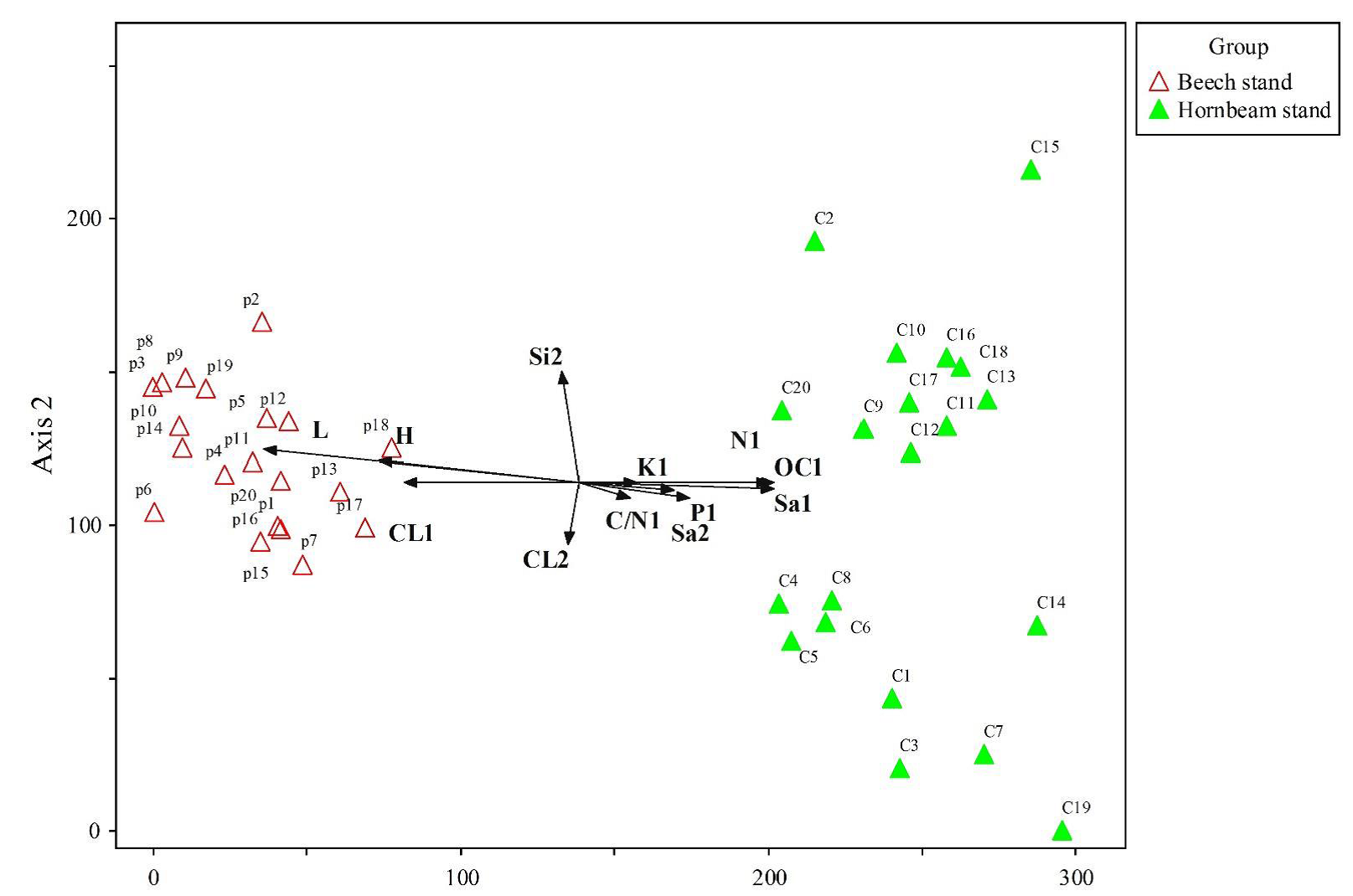 The result of DCA analysis clearly indicated that the thickness of the litter layers and humus, sand percent, total nitrogen, and organic carbon in the first layer could be considered as effective and powerful environmental variables in the distribution of sample plots in the mixed beech stand and the mixed hornbeam stand (Fig. 3). There was no significant correlation between soil organic carbon content, total nitrogen, carbon to nitrogen ratio, exchangeable potassium, exchangeable phosphorus, or pH of second layer and DCA axis (Table 7).