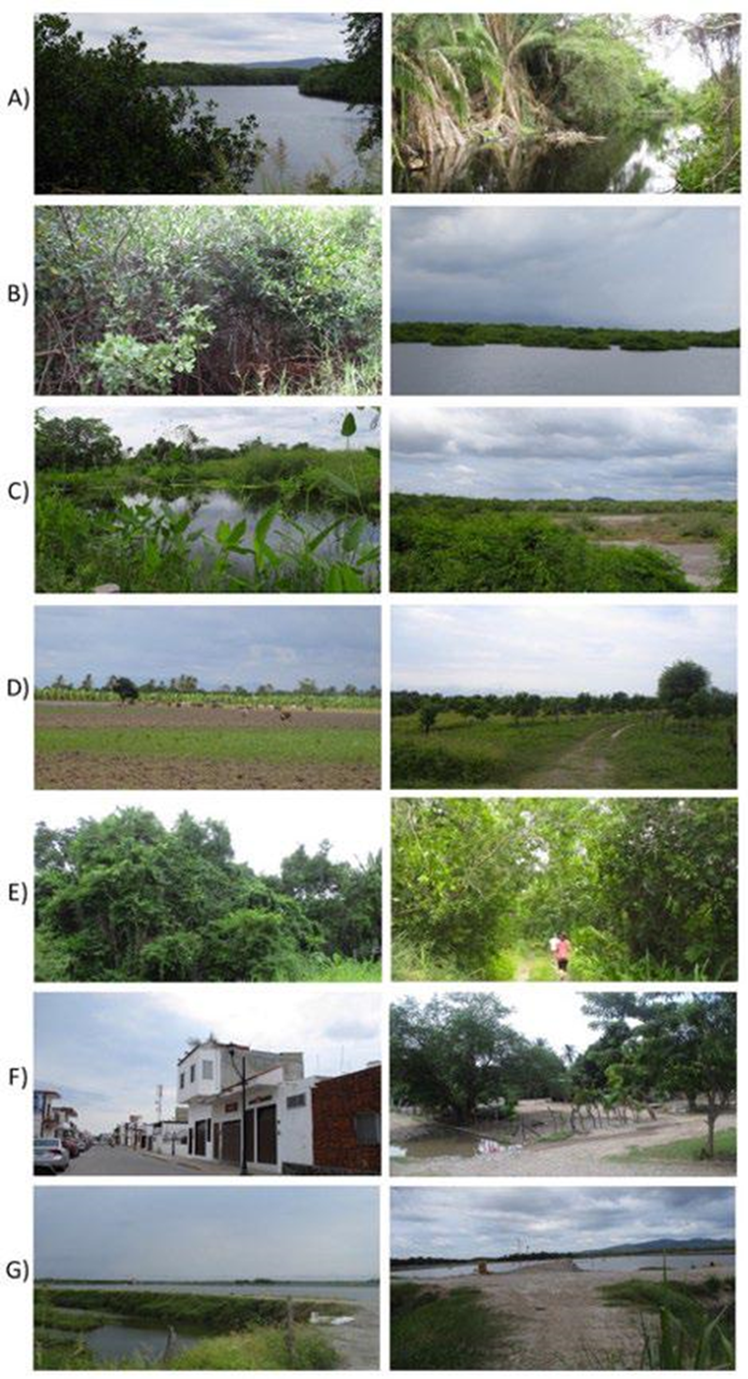 FIGURA 2 Fotografías del área de estudio ejemplificando los grupos de cobertura y usos de suelo. A) cuerpos de agua, B) cobertura manglar, C) zonas inundables, D) usos agrícolas, E) vegetación secundaría, F) poblados y G) camaronicultura.