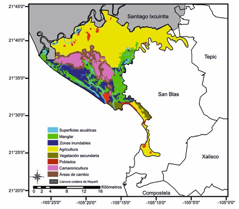 El caso de la llanura costera de San Blas en Nayarit no es distinto, esta zona es colindante con el área natural protegida llamada Reserva de la Biosfera Marismas Nacionales en el Pacífico Mexicano, sin embargo, no se encuentra dentro del decreto de protección, lo que ha propiciado su aprovechamiento, sin un correcto orden a falta de planes de manejo (Valdez, 2004). Antecedentes desde 1973 reflejan que la zona ha sufrido cambios de cobertura debido a la agricultura, las granjas camaronícolas y el uso urbano. La cobertura más afectada ha sido la selva baja, la cual perdió la mitad de su extensión en el periodo 1973-1992, con tasas de deforestación anual en aumento desde 1986, seguida de las zonas de manglar estimando 20% de pérdida para 2001 por construcción de estanquería para el cultivo de camarón. Aunque para el 2013 el impacto directo de la camaronicultura sobre el manglar fue menor a 10%, la transformación mayor se dio en las planicies de inundación con 36%, lo que termina impactando indirectamente al conjunto de manglar y humedales por la interrupción de la conectividad entre ambos (Berlanga-Robles y Ruiz-Luna, 2006; Berlanga-Robles, García, López-Blanco y Ruiz-Luna, 2010; Berlanga-Robles, Ruiz-Luna, Bocco y Vekerdy, 2011; Berlanga-Robles y Ruiz-Luna, 2013; Lithgow, De la Lanza y Silva, 2019).