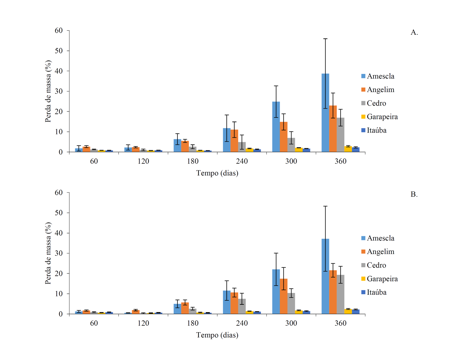 Figura 1 Perda de massa média observada para cada dia de coleta das cinco madeiras amazônicas expostas aos ensaios de deterioração em ambiente de campo aberto (A) e floresta (B).