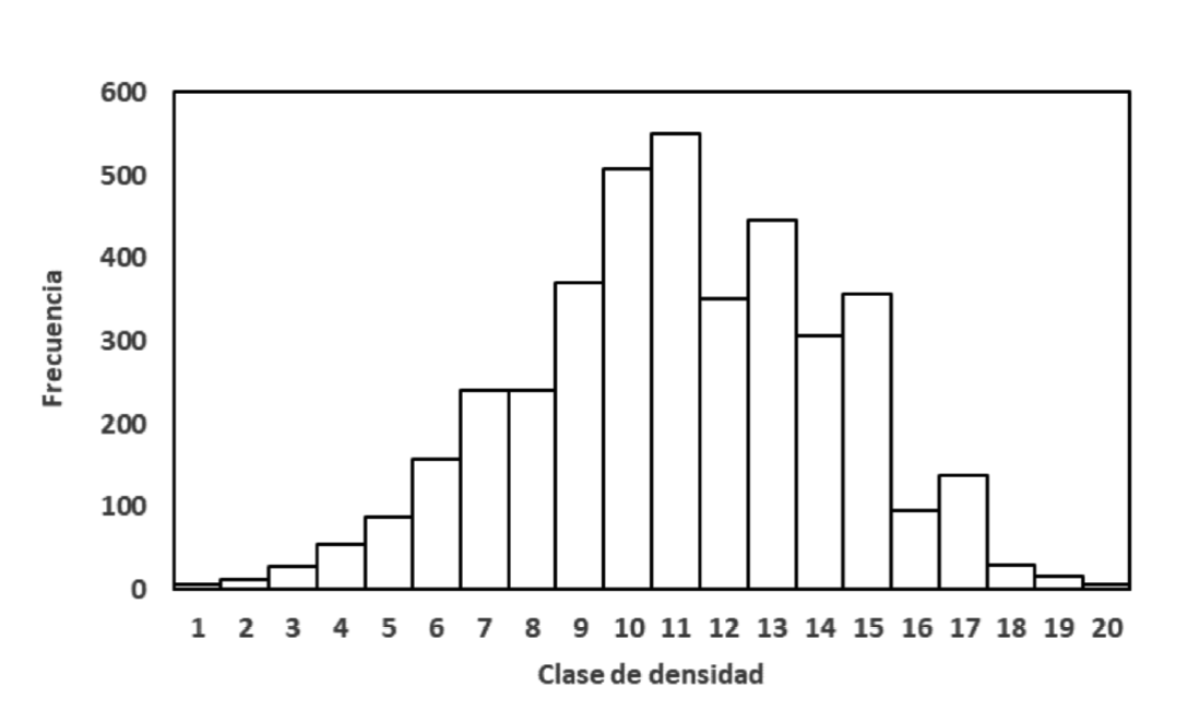 Figura 1 Distribución de frecuencias por clases de densidad de la madera. La clase 1 representa nominalmente el intervalo (0.10, 0.15], donde discretización de intervalos de clases es de 0.05 g cm-3.