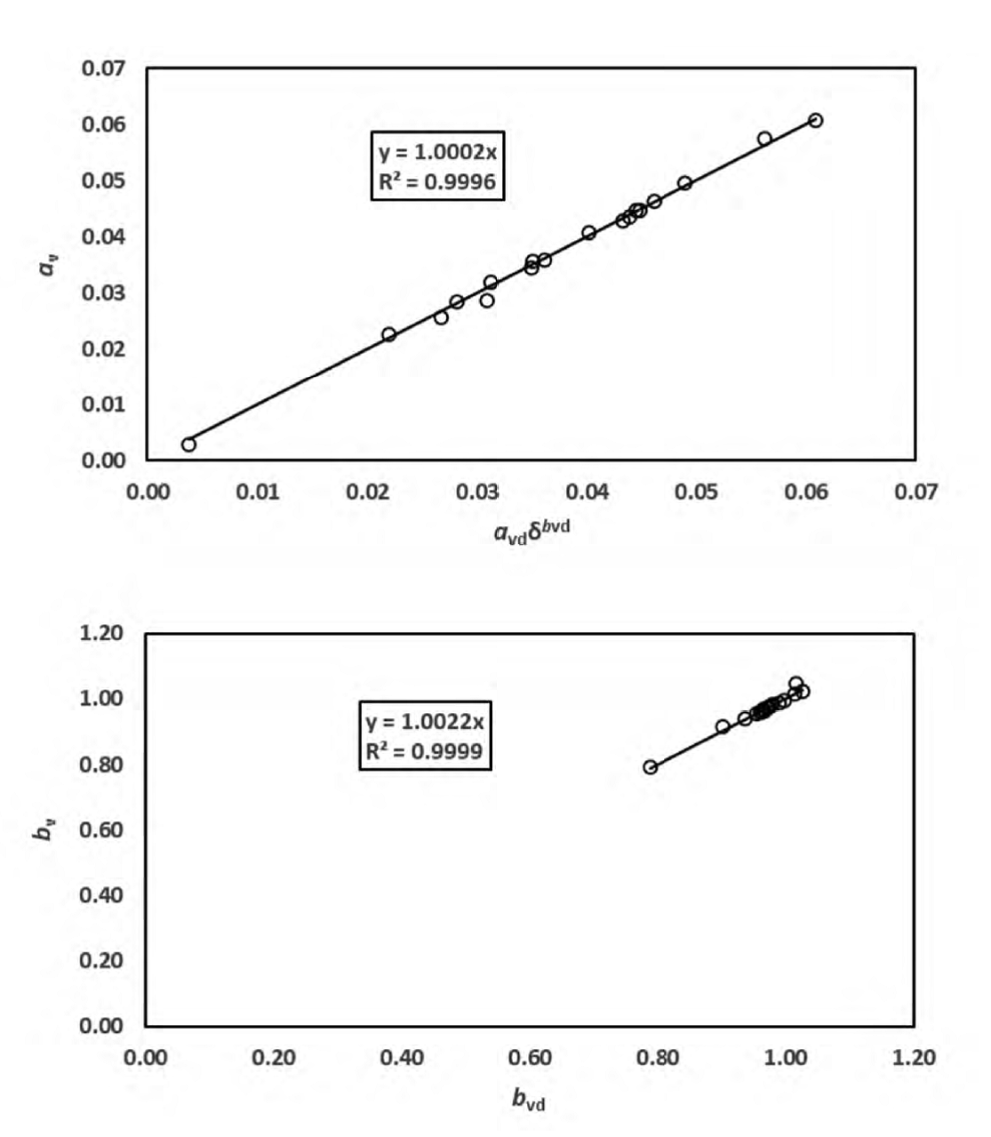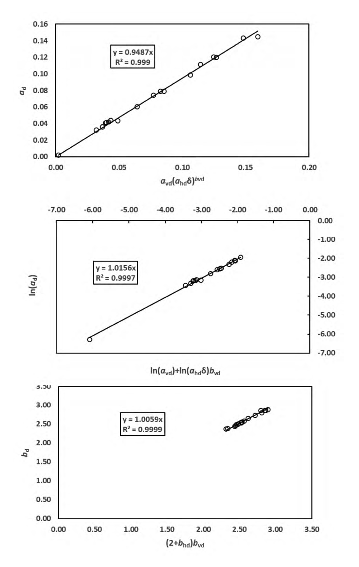 La relación (10) establece la equivalencia entre el modelo A3 con el A1, la cual está mostrada en la figura 3. Se observa que la relación de a vd (y b vd) con a d en el espacio aritmético está sesgada, dado que el error de estimación del modelo A1 es diferente al del modelo A3. La equivalencia, usando el espacio log-log y transformando la relación (10) para a d en términos logarítmicos, está mostrada en la imagen central de la figura 3. La relación entre los exponentes b es similar en el espacio aritmético y logarítmico, dado que la corrección de sesgos solo se aplica al parámetro a, relación (15).