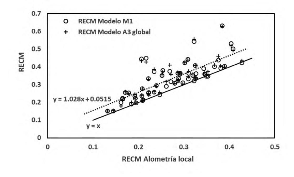 Figura 6 Comparación de las métricas RECM para el modelo A3 de alometría local (referencia) y la de los modelos A3 global y M1. La recta quebrada representa la modelo M1.