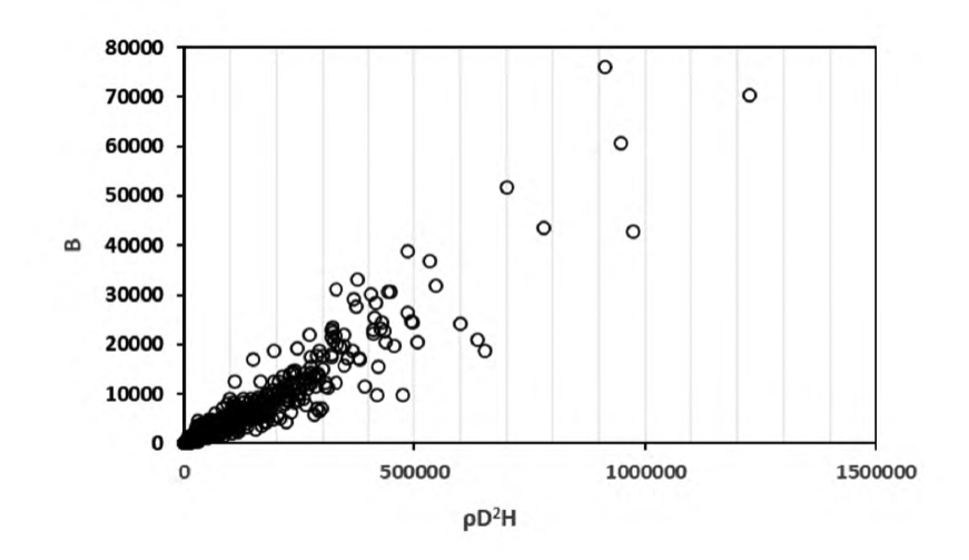 La figura 1 muestra la relación entre la biomasa B con relación a ρD2H, donde se muestra una gran dispersión, por lo que el uso de un modelo alométrico generalizado tendrá limitaciones en explicar la variabilidad observada.