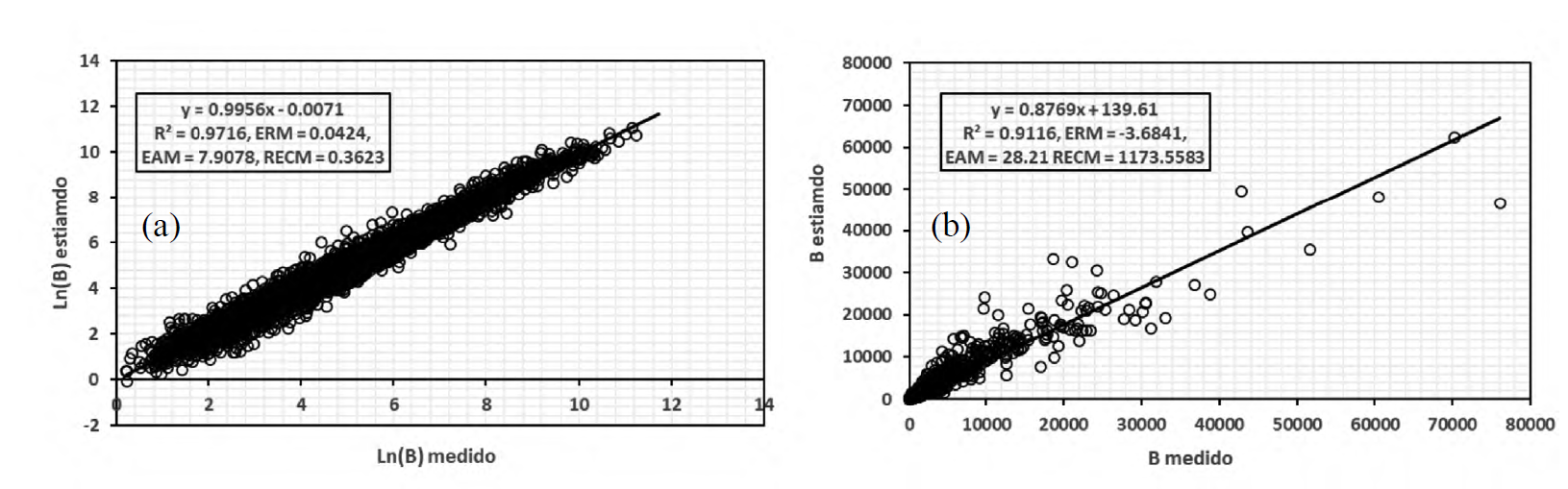 El ajuste de los modelos alométricos se analizó a través del uso de diferentes métricas de incertidumbre, incluyendo el coeficiente de determinación (R2), como la raíz del error cuadrático medio (RECM):