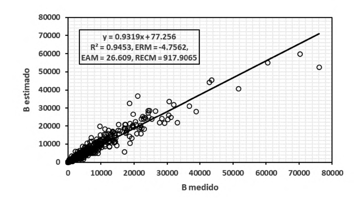 donde FCER = Promedio (Bmed)/Promedio (Best), donde Best es obtenida de la aplicación del modelo alométrico en el espacio logarítmico, sin realizar ninguna corrección, y el término est se refiere a estimada y med a medida.