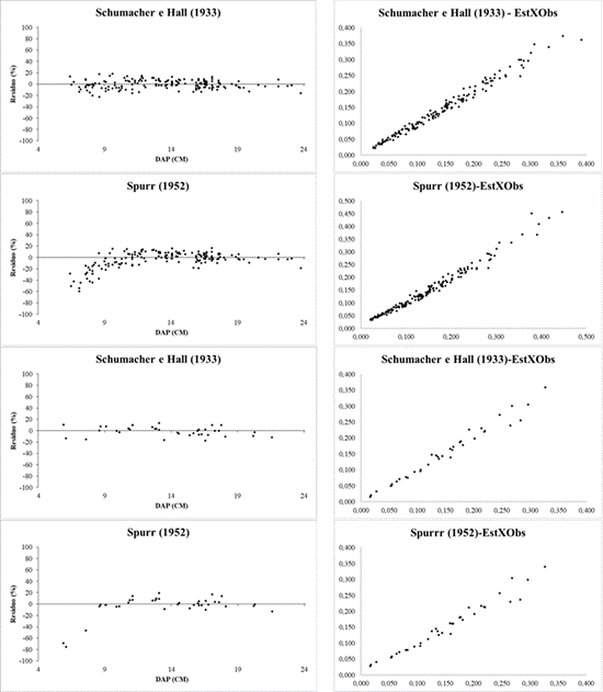 Ao analisar o coeficiente de correlação dos dois modelos, pode-se dizer que os mesmos apresentaram resultados semelhantes. Quanto a estatística RMSE%, o modelo de Schumacher e Hall demonstrou maior precisão. Para Campos e Leite (2017), esse modelo tem sido o mais difundido por resultar quase sempre em estimativas não tendenciosas. Outras pesquisas na literatura florestal, também demonstram a superioridade do modelo de Schumacher e Hall, como Müller et al. (2014) que selecionaram modelos alométricos de Eucalyptus para estimativas volumétricas sendo que o modelo de Schumacher & Hall se destacou com estatísticas ligeiramente superiores aos demais; no trabalho de Hernandes Ramos et al. (2017) na quantificação de volume comercial de clones e sementes de Eucalyptus urophylla no sudeste do México, onde os melhores modelos foram o de Schumacher-Hall seguido do modelo de Spurr. No entanto, na modelagem da relação altura-diâmetro e o volume de mognos jovens africanos estabelecidos em sistemas agroflorestais sucessórios no nordeste do Brasil estudo de Santos et al. (2019), o modelo Spurr de dupla entrada foi mais preciso do que os outros 6 modelos avaliados.