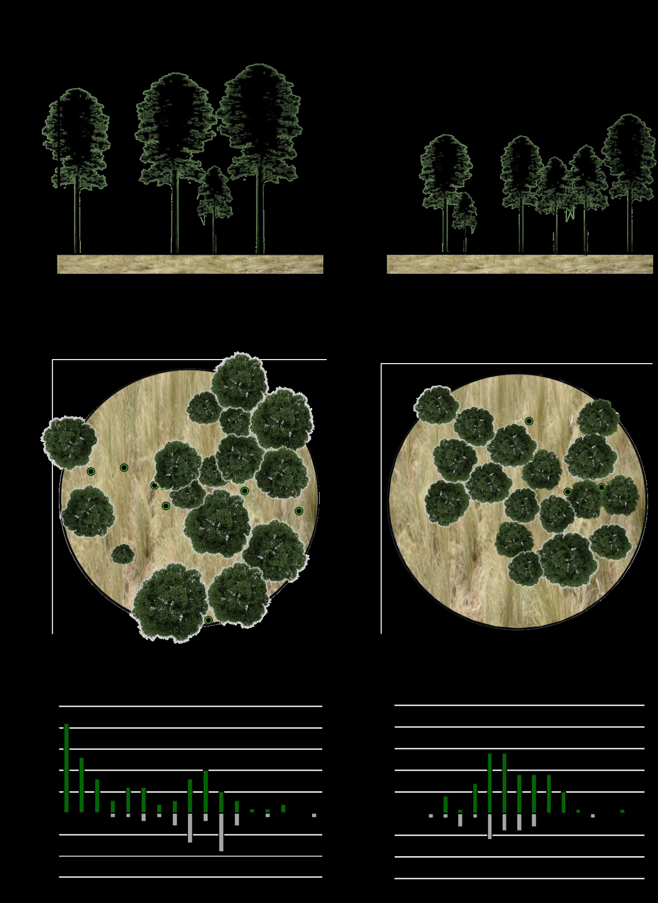 Los perfiles de la Figura 2 presentan las dimensiones promedio en DN, HT, dt, dc para cada estrato, en una línea de Oeste a Este que pasa por el centro del sitio de medición. En el apartado del inciso b de la Figura 2, se presenta la distribución de copas después del saneamiento; los círculos de color verde claro con un punto al centro representan los tocones resultados de la corta de saneamiento.