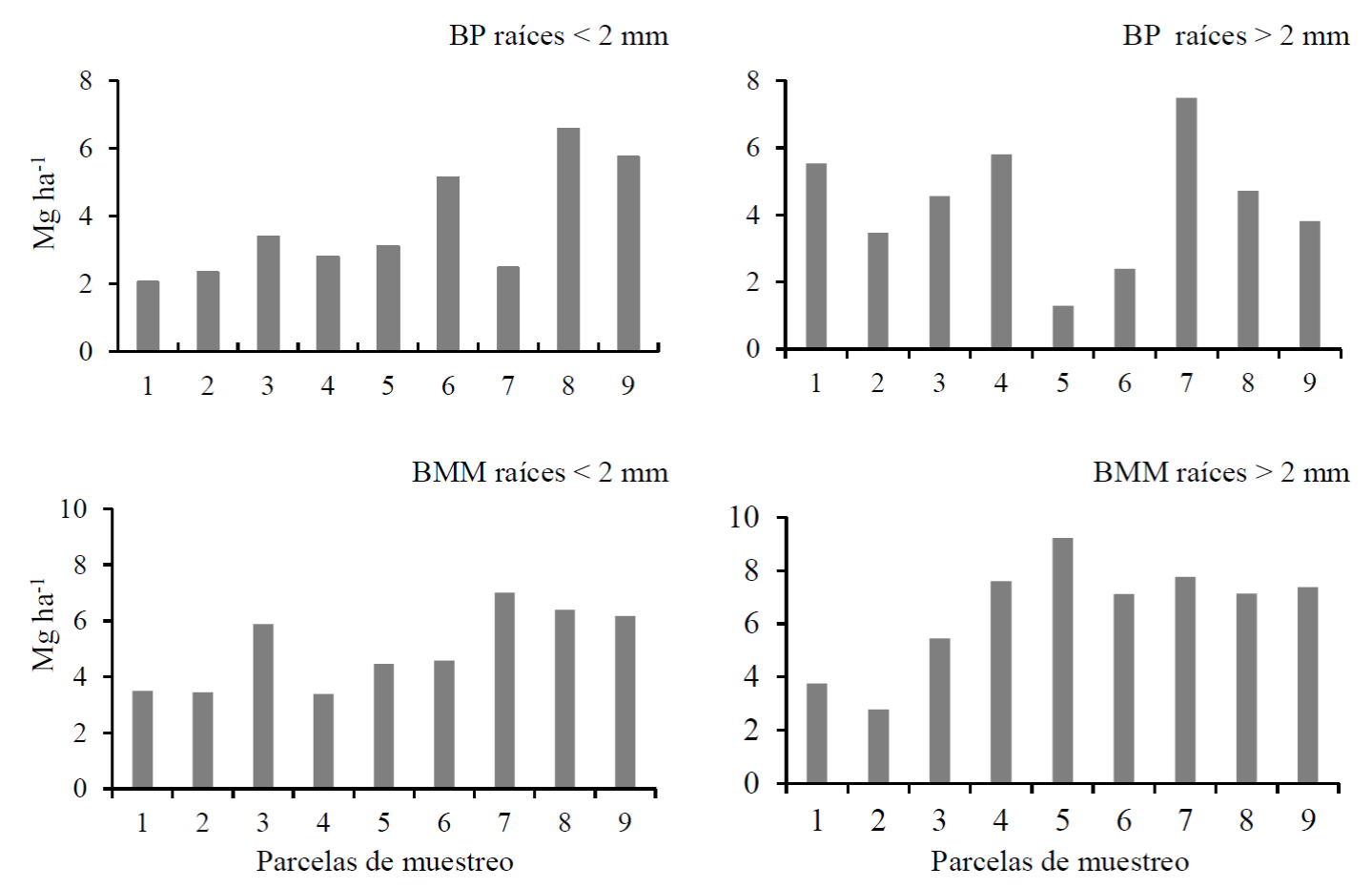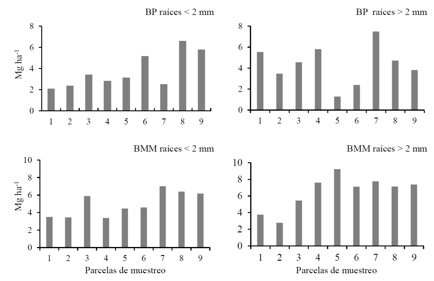 La comparación de la biomasa de las raíces menores a 2 mm entre el BP y el BMM no mostró una diferencia significativa (t16 = 1.729, p = 0.103). En el BP, la biomasa estuvo en un intervalo de 2.04 Mg ha-1 a 6.57 Mg ha-1, con un promedio de 3.72 Mg ha-1 ± 1.65 Mg ha-1; mientras que en el BMM la biomasa fluctuó entre 3.38 Mg ha-1 y 7 Mg ha-1, con un promedio de 4.34 Mg ha-1 ± 1.86 Mg ha-1 (Fig. 1). La amplitud de los intervalos de variación fue de 4.53 Mg ha-1 para el BP y 3.62 Mg ha-1 para el BMM. Esto indica que la amplitud del intervalo observado en el BP es 25% mayor que en el BMM.