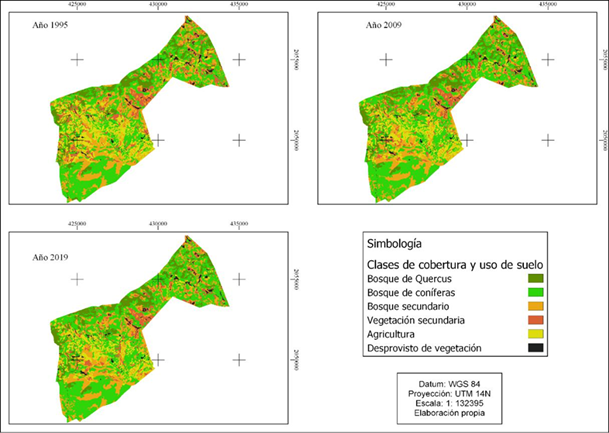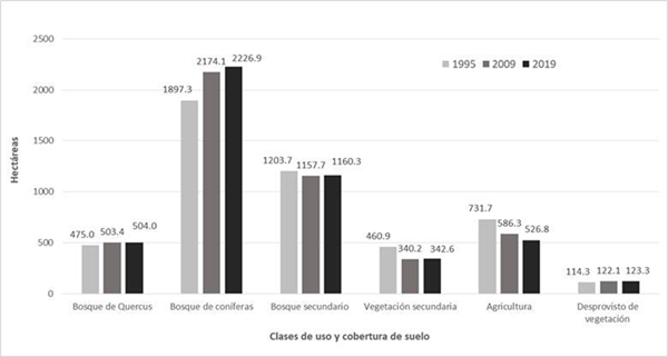Los tres mapas de cobertura y uso del suelo para los años 1995, 2009 y 2019 se muestran en la Figura 3. En la Figura 4 se presentan las superficies correspondientes de las clases de coberturas y uso de suelo derivadas de los mapas. De acuerdo con este último resultado, en los últimos 25 años hubo una recuperación del bosque de Quercus y del bosque de coníferas y una disminución de las áreas de agricultura y de vegetación secundaria.