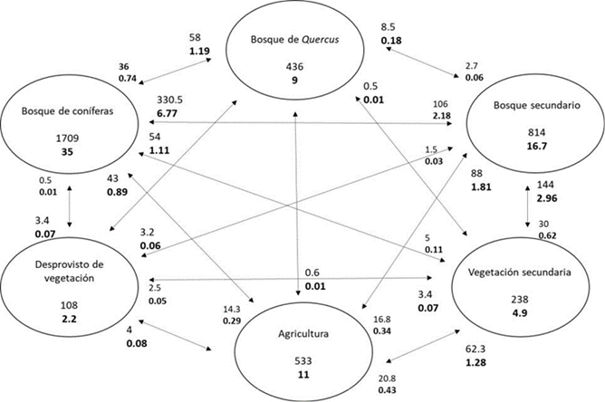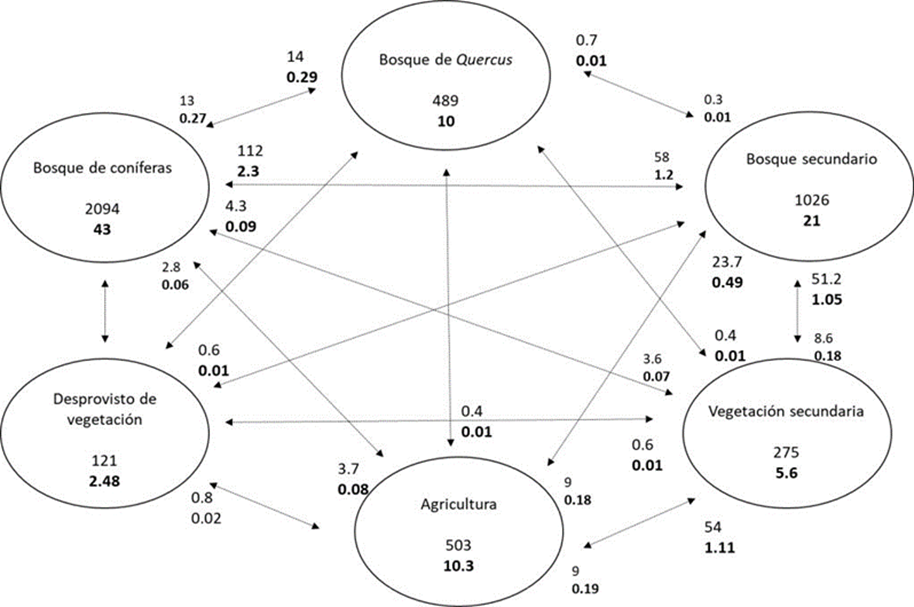 Los números en negro dentro de cada círculo corresponden al porcentaje de superficie que permaneció; las cifras alrededor de cada círculo muestran las ganancias desde la clase contraria, lo que significa una pérdida para estas clases.