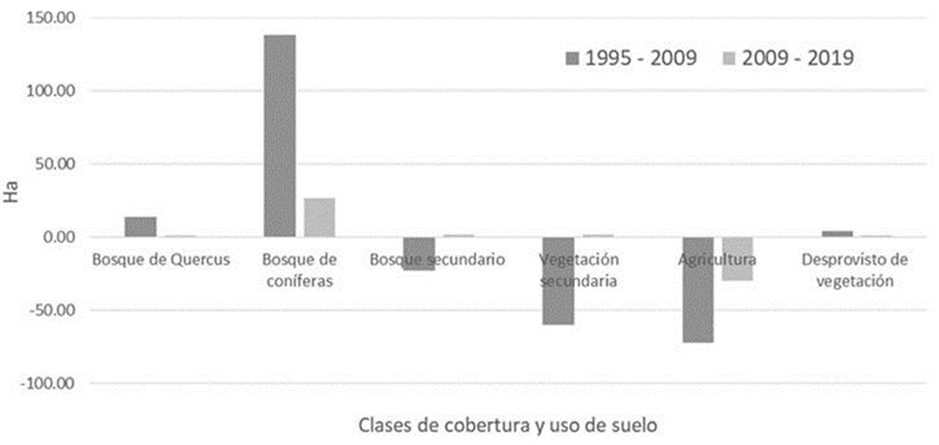 En la Figura 7 se muestra la suma de pérdidas y ganancias que experimentó cada categoría, es decir, los cambios netos para los periodos 1995-2009 y 2009-2019. Las categorías con la mayor superficie de cambios netos en el primer periodo fueron bosque de coníferas, con un incremento de 138.33 ha (2.83%) y agricultura con un decremento de 72.66 ha (1.49%). En el segundo periodo, agricultura disminuyó 29.78 ha y bosque de coníferas aumentó 26.47 ha.