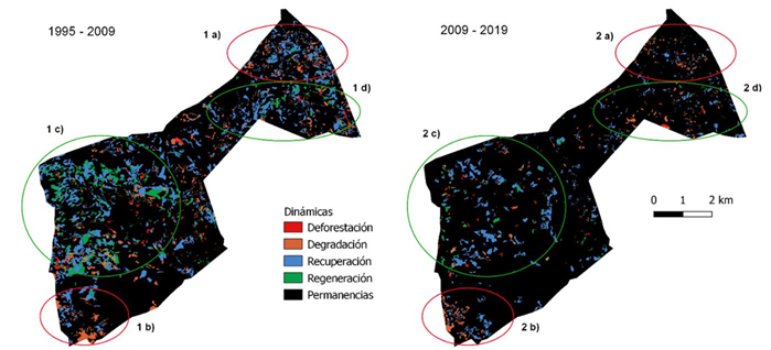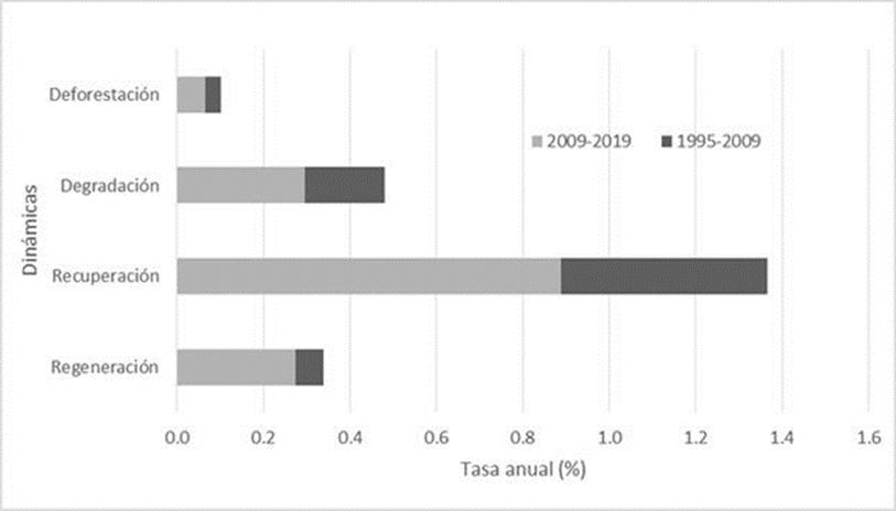 En la Figura 8, se muestran las tasas anuales de defo-restación, degradación, recuperación (revegetación) y regeneración de la cobertura forestal conforme a la agrupación de tipos de cambio propuestos en la Figura 2. Se puede apreciar que las tasas de cambio fueron mayores durante el primer periodo analizado (1995-2009) y que la clase predominante fue la que se refiere a la recuperación de los bosques.
