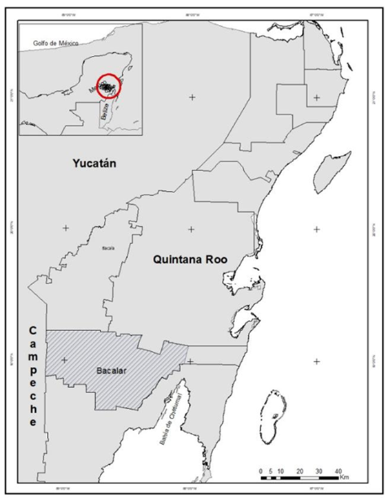El municipio de Bacalar fue constituido el 02 de febrero de 2011 mediante decreto del Congreso de Quintana Roo, segregando su territorio de Othón P. Blanco. Se ubica en el sur del estado de Quintana Roo, en las coordenadas geográficas 18°40´37” de latitud norte y 88°23´43” longitud oeste (Fig. 1), a una altitud de 20 m s.n.m. (Rodríguez-Alcalá y Fregoso-Lomas, 2015). El clima es de tipo Aw o cálido subhúmedo, con lluvias en verano y seco en invierno (García, 2004). La temperatura media anual del municipio varía entre 24 °C y 28 °C, con un intervalo de precipitación de 1100 mm a 1500 mm (Instituto nacional de Estadística, Geografía e Informática [Inegi], 2009). De acuerdo con el Inegi (2009), el suelo corresponde a los tipos Leptosol, Litosol, Redzina, Vertisol pélico, Gleysol, Regosol y Luvisol crómico. El principal tipo vegetación corresponde predominantemente a la selva mediana subperennifolia en diferentes etapas sucesionales que cubren una superficie de 404 145 ha (56.6% del territorio municipal); seguida por la selva baja subperennifolia con una superficie de 175 087 ha (24.5%), el manglar (2.1%) y el tular (2.0%). Las selvas maduras cubren 81 691.52 ha (11.4% del territorio municipal; Gobierno del Estado de Quintana Roo (2011-2016), s. f.; Inegi, 2016). Dentro de esta gran matriz de vegetación están los usos agro-pecuarios con una superficie de 89 531.86 ha (12.5% de la superficie municipal). Los cuerpos de agua, princi-palmente lagunas y cenotes, cubren tan solo 1.1% de la superficie total del municipio (Inegi, 2009).