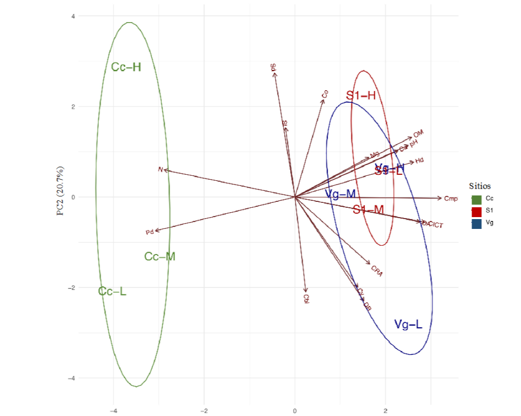 Las variables fisicoquímicas consideradas fueron densidad aparente (DA), densidad real (DR), porcentaje de humedad (Hd), porosidad (Pd), arena (Sd), arcilla (Cy), limo (St), capacidad de retención de agua (CRA), carbono total (Co), carbono biomasa (CbI), potencial de hidrógeno (pH), porcentaje de materia orgánica (MO), capacidad de intercambio catiónico (CICT), nitrógeno (N), magnesio (Mg) y calcio (Ca), compactación (Cmp).
