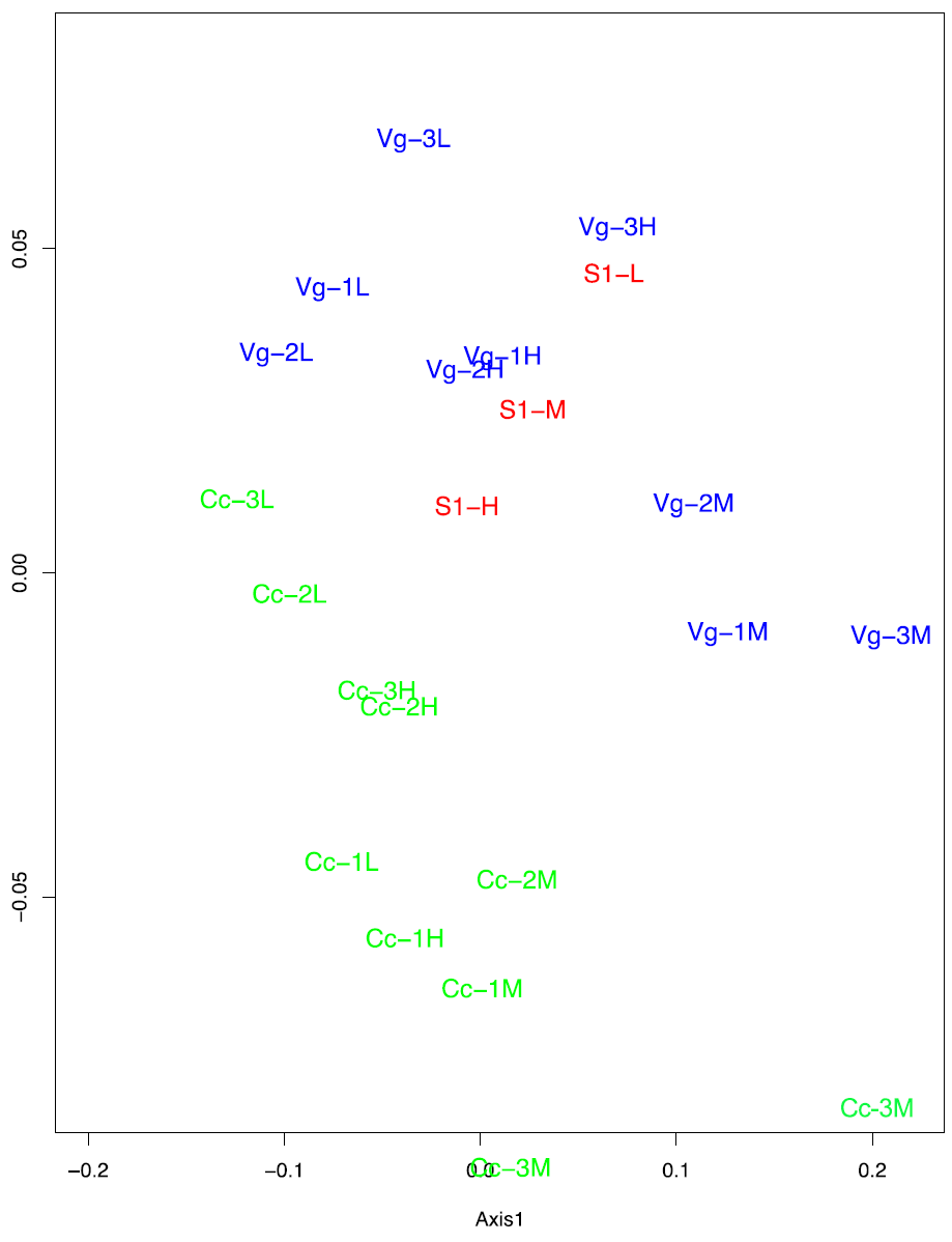 En el mapa de calor, las correlaciones débiles entre las variables se muestran en verde, mientras que las correlaciones más fuertes se muestran en rojo (Fig. 4). El análisis separó dos grandes clados de sitios, cada uno subdividido en dos subgrupos. El primer sitio, integrado por vegetación alterna (Vg-H), está correlacionado con los sitios de recuperación natural (S1-M y S1-L). El otro clado se subdividió en dos subgrupos, un grupo mostró asociación entre los sitios Cc-M y Cc-L y otro subgrupo correlacionó los sitios Cc-H, S1-H, Vg-M y Vg-L.