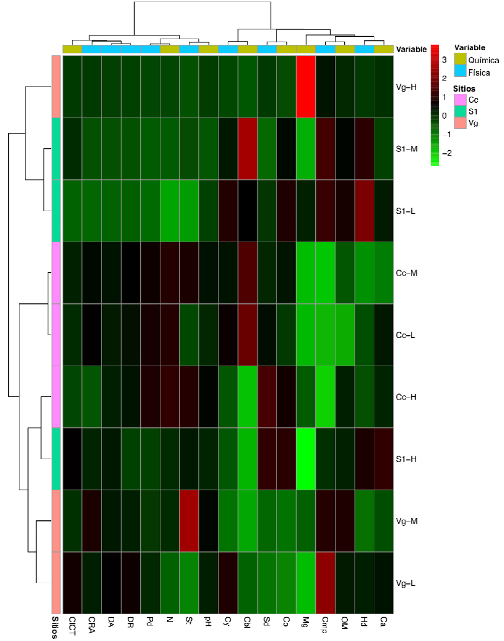 Además, el análisis del mapa de calor generó un dendrograma que diferenciaba dos clados en las propiedades fisicoquímicas del suelo (Fig. 4). El clado 1 está formado por cuatro propiedades físicas (Hd, Cmp, Sd y Cy) y cinco químicas (Ca, MO, Mg, Co y CbI) que mostraron valores más altos en S1-M, S1-L y Vg-H, mientras que en Cc-M y Cc-L fueron inferiores. El segundo clado se correlacionó con cinco propiedades físicas (St, Pd, DA, DA y CRA) y tres propiedades químicas (pH, N y CICT), donde Cc-M y Cc-L registraron los valores más altos y S1-L los más bajos.