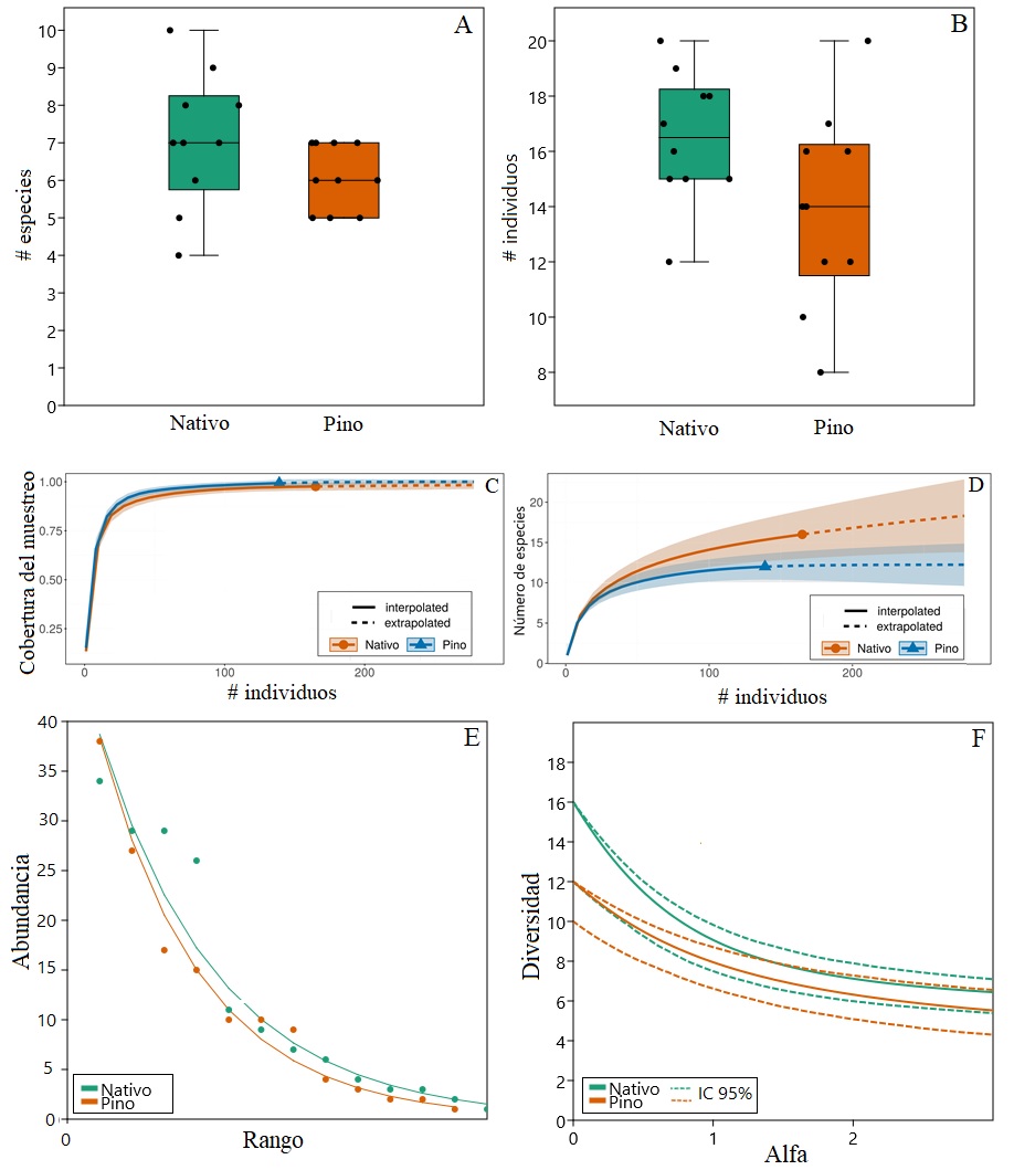 El muestreo realizado fue representativo, con una cobertura estimada de 99 % para el sitio pino y 98% para nativo, y muestra la misma tendencia asintótica ante una extrapolación hecha al doble de los individuos de la parcela menos abundante (pino) (Fig. 1C). De acuerdo con la estimación de especies, mediante la extrapolación, se sugiere un máximo de 18 especies (± 5,94, para intervalos de confianza de 95%), es decir, dos especies más que las encontradas. Para pino no se estima mayor número de especies si se incrementara al doble el esfuerzo de muestreo (± 2,79, para intervalos de confianza de 95%) (Fig. 1D).