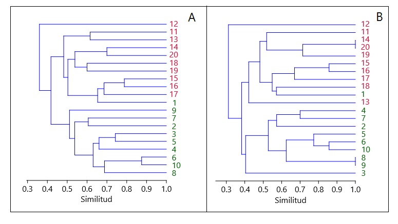 A: agrupamiento calculado por distancias de Bray-Curtis, basadas en abundancias. B: agrupamiento calculado por distancias de Jaccard para datos basados en presencia y ausencia.