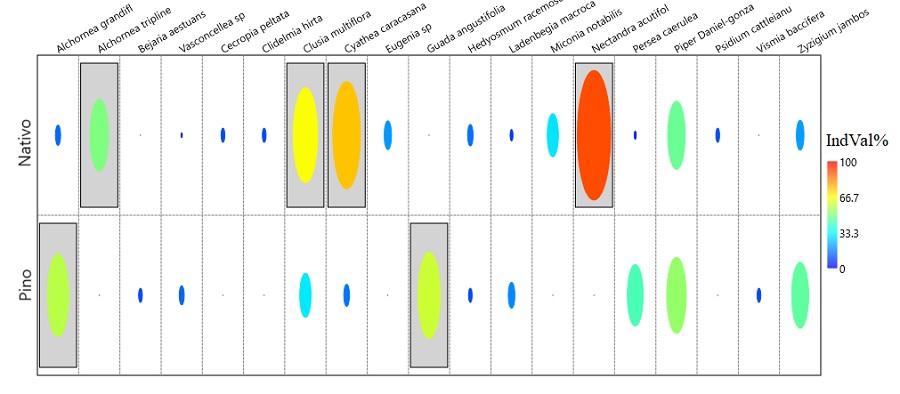 El análisis de especies indicadoras sugiere significancia para dos especies en pino: Alchornea grandiflora (IndVal% = 57,44; P = 0,0382) y Guadua angustifolia (IndVal% = 60,00; P = 0,0061); y para cuatro de nativo: Alchornea triplinervia (IndVal% = 50,00; P = 0,0153), Clusia multiflora (IndVal% = 65,91; P = 0,009), Cyathea caracasana (IndVal% = 74,36; p = 0,0047) y Nectandra acutifolia (IndVal% = 90,00; P = 0,0001) (Fig. 3).