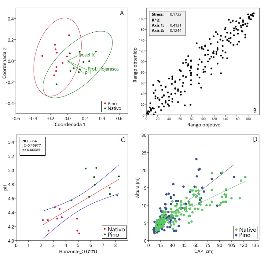 A: Análisis de ordenamiento multidimensional no métrico (NMDS) por distancias de Bray Curtis. B: gráfico de dispersión para el desempeño del modelo asociado a los ejes de ordenación del NMDS. C: Relación entre la profundidad del Horizonte O y el pH de las parcelas de pino. (intervalos de confianza del 95% en líneas azules). D: Análisis ANCOVA para la relación del DAP (cm) y la altura (m).