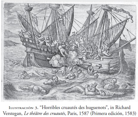 Dos fenómenos mayores tienen que resaltar aquí. Por un lado, este grabado representa una destrucción y esta representación se consuma en la desaparición de la imagen misma, sumergida en el caos que nos hace ver, llevada al límite de los indiscernible. Comparemos, para convencernos, el grabado de la pinteure spirituelle con la del Teatro de la crueldad de Richard Vergsten (1587) (vid. ilustración 3) para el mismo episodio: el padre Ignacio de Azevedo es propulsado al primer plano de la representación, señalado con una letra (A, la única letra inscrita en el plano de la imagen) y glosado en el comentario que conduce a la mirada: