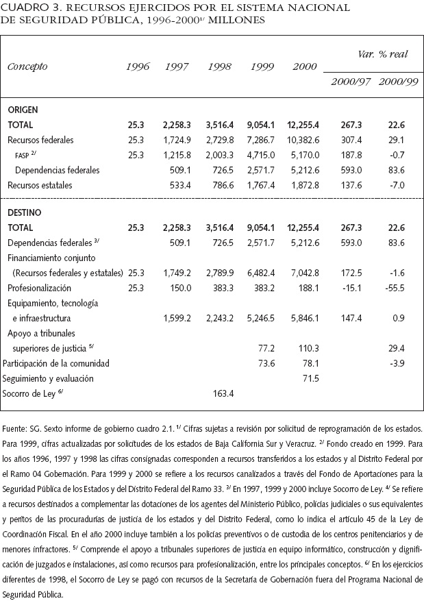 Cabe hacer notar que los primeros pasos importantes hacia un sistema nacional de seguridad pública no son nuevos. Ya en diciembre de 1994 se promovió un cambio a los artículos 21 y 73 (fracción xxiii) constitucionales de México, en que se estableció como obligación de Estado la coordinación entre los tres órdenes de gobierno de la seguridad pública. En 1995 se diseñó un sistema de coordinación de seguridad pública nacional en todos los niveles de gobierno (Sistema Nacional de Seguridad Pública, SNSP), pero, dada la estructura de la impartición de justicia en los diversos órganos judiciales y de los ejecutivos, mantuvo la distribución de sus competencias y un sistema en general "atomizado", donde la coordinación asume que será efectiva y sin corrupción. Para reducir los problemas de esta índole, se tomaron medidas jurídicas como dotar de independencia a la Suprema Corte de Justicia Federal, establecer que la entonces Policía Federal Preventiva (PFP) fuera depositaría de la prevención de delitos federales graves (narcotráfico y crimen organizado), lo cual es condición necesaria pero no suficiente para lograr contar con un sistema de justicia realmente dentro de la globalidad, promotor de la competitividad del país y responsable, junto con la sociedad, de la transparencia, rendición de cuentas y estado de derecho. Adicionalmente, los temas de prioridad sobre seguridad estaban en el mismo nivel. Todo ello cambió después del 9/11 (Véase Sexto Informe de Gobierno, 2000).