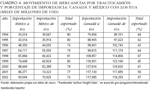 Asimismo, apuntan que el papel de los transportistas y su armonización de prácticas aduaneras y de inspección son clave para el comercio con seguridad. El cuadro 4 muestra la importancia del comercio por tractocamión, sobre todo de México, con 76% del total exportado por el país, que contrasta con 57% solamente de Canadá hacia los EUA. Con ello se resalta que las decisiones de inversión y el reto de la administración aduanera y de puentes fronterizos moderna y aceptada por los jugadores relevantes, sobre todo en los accesos por carretera, representan condicionantes planteados por los EUA, pero que serían internalizados y adoptados por gobiernos y empresas en México, si representan claramente beneficios económicos netos, como los apunta la NEI.