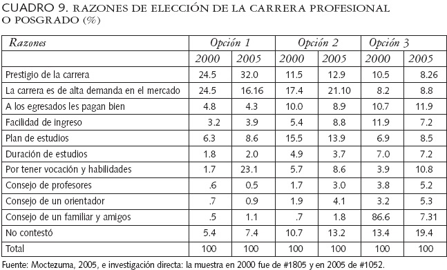 La decisión individual de elegir una carrera a nivel superior se relaciona con factores personales asociados a valores de mercado, familiares y sociales, así como a ciertas habilidades que se desean adquirir. Al preguntar las tres razones principales por las cuales los estudiantes eligen su carrera, como primera opción han predominado tanto el prestigio de la carrera, con 24.5 por ciento, como la alta demanda en el mercado, con 24.2 por ciento. Como segunda razón, la elección también se centra en valores asociados al mercado, ya que eligen una carrera por tener alta demanda de mercado, con 17.4 por ciento, y por un valor académico asociado al plan de estudios, con 15.5 por ciento, lo cual es reafirmado en la tercera razón (ver cuadro 9). En general, en los estudiantes están más presentes los criterios de mercado que los académicos a la hora de seleccionar una opción de formación profesional, lo cual es indicativo de que tienen más claridad de los resultados que esperan que de los medios y esfuerzos que requieren para lograrlo. Es destacable el hecho de que mientras los estudiantes tienen mucha claridad de los valores de mercado que buscan, la orientación al mercado profesional de los planes de estudio dista mucho de estar clara en su contenido y en su forma, pues en general predomina la organización excesivamente escolarizada de los planes y programas de estudio. Esto significa que si bien la calidad académica de las instituciones se relaciona con la calidad de sus modelos académicos y con la eficiencia en los procesos de administración, esto se valida por el nivel de articulación y adaptación de cada IES a su entorno y por la inserción de sus egresados en el ámbito productivo y social, percibido a través de su desempeño en el medio laboral.