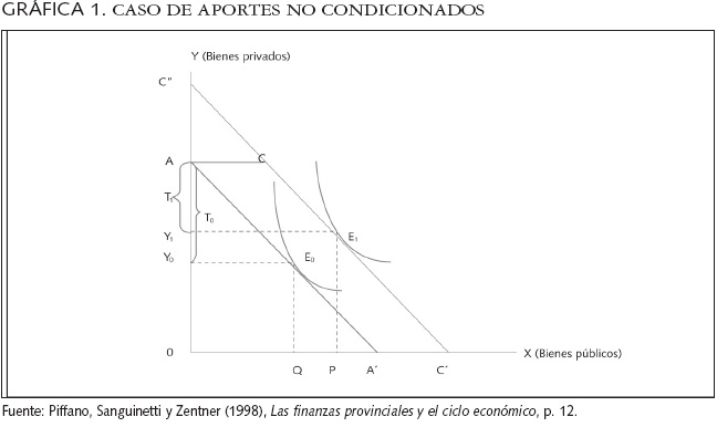 Por otra parte, es importante rescatar el análisis que reconstruye Piffano (1998, 11) a partir de Oates (1977, 106-110) en relación con el efecto ingreso que las transferencias tienen sobre el gasto público. El autor plantea que los "aportes no condicionados" a los gobiernos locales son equivalentes a "transferencias de ingreso", deduciendo de ello que el incremento del gasto público local dependerá de la elasticidad ingreso que éste tenga para la comunidad local; mientras que los "aportes condicionados" estimularán un mayor gasto público local, en tanto que junto al "efecto ingreso" se produce además un "efecto precio" al reducirse el costo marginal de los incrementos en el gasto local, en este caso, los cambios en el gasto están sujetos a la elasticidad precio correspondiente. Piffano elabora una explicación gráfica de este razonamiento, la cual se reproduce a continuación por considerarla un valioso aporte a la discusión (Piffano, 1998, 12-14). En la gráfica 1 se analiza el caso de un aporte no condicionado, en el cual las curvas de indiferencia corresponden al "votante mediano" de un gobierno sub-nacional.