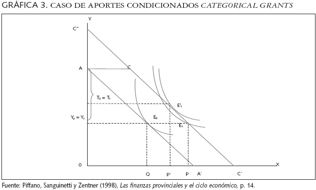 Por último, plantea Piffano que si el aporte federal es condicionado del tipo categorical grants, es decir, con destino total a determinado gasto público específico, la situación es la que se presenta en la gráfica 3.