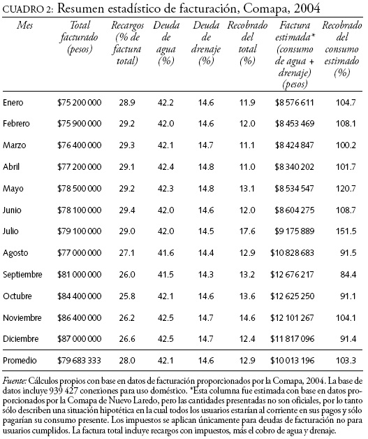 Un problema importante asociado con la existencia de información confiable sobre la salud financiera de la Comapa es que no se publican de manera sistemática los reportes financieros completos del organismo (los reportes anuales de la Conagua son las únicas fuentes disponibles para los organismos del agua en México y no reportan información para Nuevo Laredo para los años 2003 y 2004). Para 2005, la Comapa reportó a la Conagua una cantidad recaudada cercana a la cantidad estimada en este trabajo utilizando un consumo hipotético regular (excluyendo recargos y deudas). Esto sugiere que la Comapa no reporta estadísticas sobre su facturación adeudada.14 De hecho, algunos miembros del Consejo de Administración y activistas sociales argumentan una falta de transparencia de la administración sobre los ingresos de los servicios (Salinas, Canturosas, Camacho y González, entrevistas).15