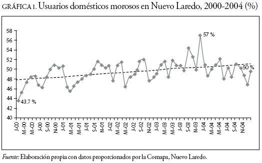 La gráfica 1 muestra una tendencia creciente en el porcentaje de conexiones con deudas para el periodo 2000-2004. Los funcionarios del organismo operador comentan, basados en su experiencia, que la morosidad se extiende a toda la ciudad y no sólo en áreas de bajos ingresos (El Mañana, 2006). Aproximadamente 51 por ciento de las cuentas no pagó sus facturas a tiempo en 2004 (véase el cuadro 2). Tomando en cuenta que sólo 46 por ciento de las viviendas regularmente no las mismas viviendas pagan sus facturas de agua en forma puntual, estimamos que alrededor de 3 por ciento de las viviendas realiza pagos parciales.