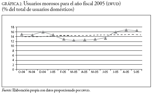 Si un usuario no paga su factura a tiempo, recibe una notificación de adeudo con un plazo adicional de 15 días para pagar.17 Esa fecha marca también el vencimiento del servicio, un día después el usuario es desconectado. El LWUD cobra un cargo adicional de 5 por ciento por pago tardío, este porcentaje lo aplica sobre el monto del adeudo. Los empleados encargados de la desconexión no aceptan pagos directos, una razón es que esto ocasionaría costos administrativos (por ejemplo, por la autorización de cheques). A pesar de la relativamente baja tasa de morosidad, al final del año fiscal 2004-2005, el LWUD registraba un adeudo de 1017856 dólares, lo cual equivalía a 6.8 por ciento de la facturación total anual.