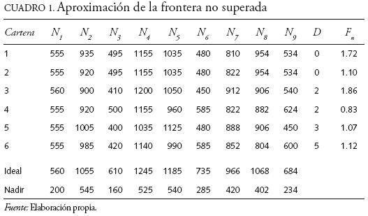 Si no se dispone de una medida de valor de la cartera, un enfoque posible consiste en abordar la búsqueda de la mejor cartera a través de la optimización multiobjetivo. En la literatura se reportan numerosas aplicaciones para la distribución de recursos públicos (cf. Zanakis et al., 1995; Steuer y Na, 2003 para revisiones documentadas de esas propuestas). Dentro del espacio de carteras se busca una solución de Pareto aceptable de un problema de optimización vectorial. Los objetivos representan ciertos beneficios o costos sociales de cada proyecto apoyado, de manera que se puedan cuantificar en alguna escala y agregar a nivel de cartera. La forma matemática es de un problema de mochila multiobjetivo. Apreciablemente, el método más utilizado es la programación por metas 01 (Chan et al, 2005; Steuer y Na, 2003; Lee y Kim, 2001; Badri et al, 2001; Fandel y Gal, 2001; Santhanam y Kyparisis, 1995; Zanakis et al, 1995). La solución de Pareto se obtiene por la asignación de ciertas metas para cada objetivo (modelación a priori de las preferencias del DM).