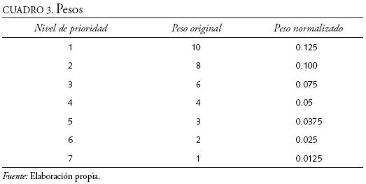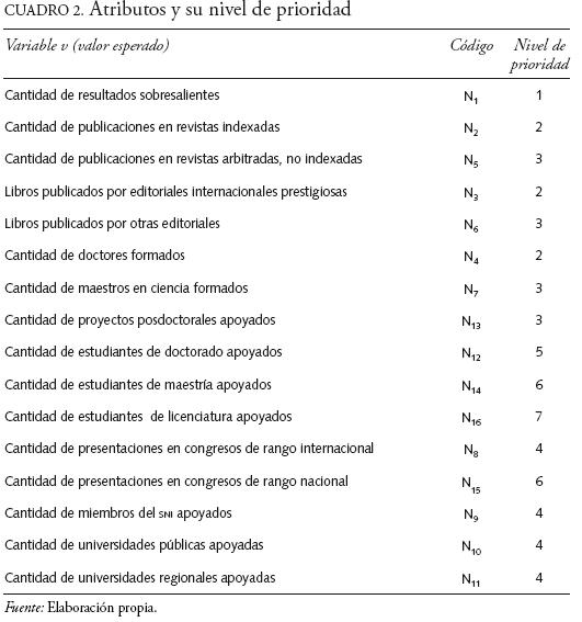 Este ejemplo simula la financiación de proyectos básicos de investigación. Además de varios criterios clásicos de las investigaciones (avances importantes, publicaciones, formación de recursos humanos), el DM está interesado en apoyar a miembros del Sistema Nacional de Investigadores (SNI), universidades públicas, universidades regionales, estudiantes de posgrado e incluso estudiantes universitarios sobresalientes. Los atributos relevanteslas variables vi del problema (5) y sus niveles de prioridad se muestran en el cuadro 2.