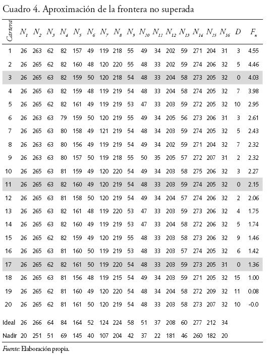 El experimento se replicó en otras cuatro instancias aleatorias. El tiempo promedio de ejecución fue aproximadamente de ocho minutos. En todos los casos el algoritmo fue capaz de determinar uno o dos mejores compromisos en la frontera no superada, utilizando la información de los conteos de debilidad y flujo neto.