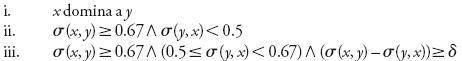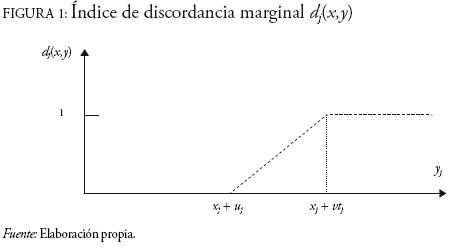 La región factible se define por restricciones al presupuesto general. σ(x, y) fue calculada por el método ELECTRE (cf. Roy, 1990), como en la sección "Modelo borroso de preferencias". Los parámetros del modelo son pesos, umbrales de indiferencia, preferencia y veto. La información sobre los "pesos" se proporciona en el cuadro 3.