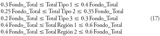 Un hipotético DM está resolviendo un problema de cartera con cien proyectos candidatos, cada uno de ellos con un beneficio directo sobre ciertos estratos de la población. El DM considera tres niveles de impacto (alto, medio, moderado) y tres segmentos de la población (extrema pobreza, pobreza, clase media baja). Dispone de recursos por 25 000 millones de pesos. Los proyectos se dividen en tres tipos por su naturaleza y en dos regiones geográficas. El DM desea mantener cierto balance en la cartera, por eso se imponen las siguientes restricciones por tipo y por región: