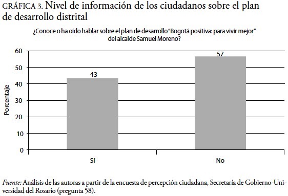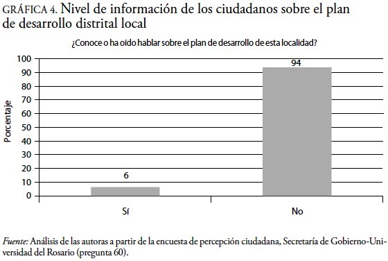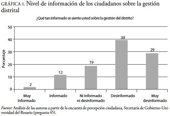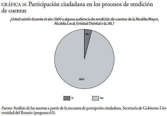 Por lo anterior, podríamos afirmar que los ciudadanos en las localidades que integran el distrito no están ejerciendo sus derechos ni sus obligaciones ciudadanas tal como lo esperarían los supuestos teóricos en los que se sustenta el actual proceso de descentralización de la ciudad y como lo esperaba el estatuto orgánico de Bogotá que apostó por la capacidad de control de los bogotanos sobre su administración pública distrital.