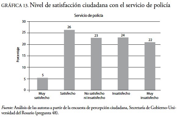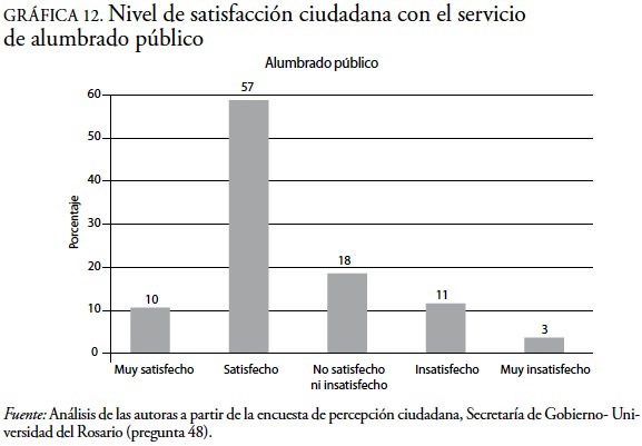 En el caso de Bogotá, los servicios que mayor demanda y presiones revisten desde la ciudadanía son prestados por el sector central de la administración que, resguardado en los argumentos de carácter técnico y en las economías de escala de la prestación de los mismos, sigue definiendo desde el sector central su futuro. Nos referimos a todos los servicios públicos domiciliarios (agua, alcantarillado, luz, gas, telefonía), así como a los sociales de alta repercusión como educación, salud y seguridad ciudadana. Con respecto a estos servicios prestados por el sector central, la encuesta muestra elevados grados de satisfacción frente a la prestación de los mismos (caso alumbrado público), y contrasta con el hecho de que los servicios de seguridad y de manejo de asuntos de policía, que están a cargo de las localidades, sean los de más bajo nivel de aceptación (véanse las gráficas 12 y 13).