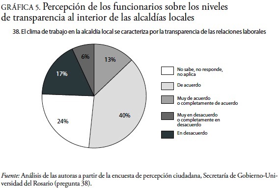 La transparencia, que sería un principio básico de nuevas costumbres democráticas, y que en casos ideales debería aproximarse a 100 por ciento, es percibida al interior de las alcaldías locales como un asunto dudoso, como lo muestra la gráfica 5 de la encuesta de clima organizacional.