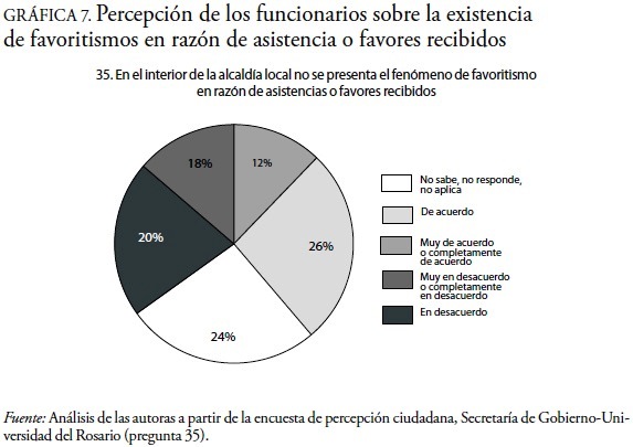 Así, 53 por ciento de los funcionarios sostiene que el clima de trabajo se caracteriza por la transparencia, pero 23 por ciento afirma expresamente que no es así y 24 por ciento prefiere no pronunciarse al respecto. Más notable resulta la brecha cuando el tema de transparencia se remite a asuntos específicos y en particular al de "favores recibidos" o de filiación política, como se observa en las gráficas 6 y 7.