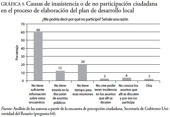 Los encuestados afirman, en la mayoría de los casos, no haber participado en las instancias de decisión relacionadas con la formulación del plan de desarrollo local. Contrario a la afirmación de que las localidades constituyen un instrumento y un territorio abierto para involucrar a los habitantes en la solución de los problemas que los aquejan, lo que los datos muestran es un marcado desinterés por parte de la población, un notable desconocimiento de los procesos y de las instancias de participación y una generalizada apatía por los temas locales (véanse las cifras en las gráficas 8 y 9).