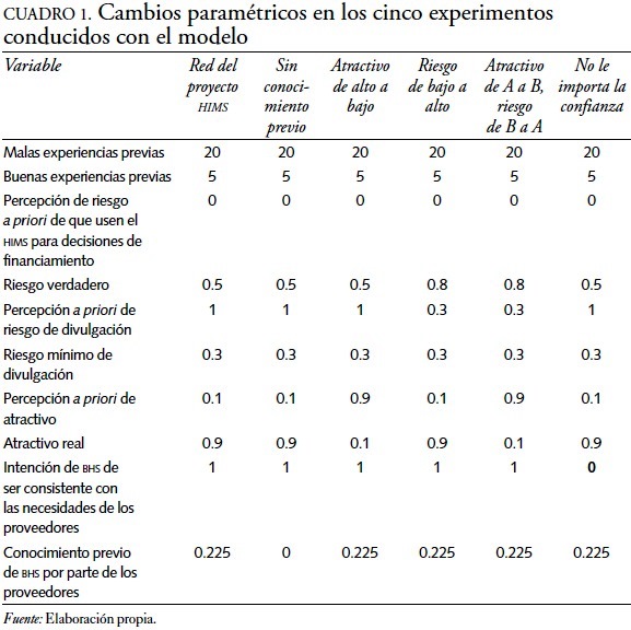 En términos de los parámetros asociados con el componente calculador de la confianza, el riesgo inicial o a priori de la divulgación de la información confidencial del cliente inicia en un nivel de 1 en el modelo (los parámetros de riesgo y conveniencia se miden en una escala arbitraria entre 0 y 1, incluyendo a 0 y 1). El riesgo asociado con el uso de HIMS para decisiones financieras inicia en 0, dado que los proveedores no se percatarán de este riesgo hasta aumente su comprensión de las implicaciones del proyecto. El valor mínimo de riesgo de divulgación es 0.3, considerando que siempre hay riesgos asociados al manejo inadecuado de la información a pesar de la reglamentación que protege los derechos de los clientes. El verdadero riesgo del proyecto (asociado con el uso de la información en HIMS para decisiones de financiación) tiene un valor moderado de 0.5. El valor a priori de conveniencia, por otro lado, es igual a 0.1 y refleja la falta de entendimiento por parte del grupo de los proveedores de los beneficios del proyecto HIMS. Sin embargo, el valor verdadero de conveniencia es igual a 0.9, y refleja el hecho de que HIMS fue un proyecto del cual los proveedores pudieron obtener beneficios importantes.