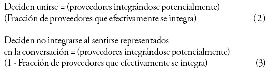 El modelo considera la estructura de la red de proveedores, de manera particular la existencia del comité de tecnología ad hoc. El equipo CTG-BHS buscaba integrar al proyecto a un grupo de proveedores nuclear y lograr una masa crítica para que le dieran legitimidad y proveyeran información y conocimiento al proceso. Por otro lado, la decisión del núcleo representativo del comité tecnológico de participar en el proyecto y la confianza del resto de los proveedores en este grupo nuclear, hizo que algunos proveedores no se unieran a las conversaciones porque se sentían representados por este grupo nuclear. cuando la fracción de la masa crítica se acerca a uno, la fracción que efectivamente se integra se acerca a cero y el flujo de personas que deciden no unirse se acerca al número de proveedores que potencialmente se unirían (ecuaciones 2 y 3).