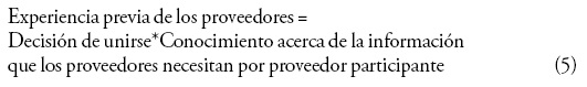 El proceso presentado en la sección anterior se integró con el modelo de confianza presentado en la figura 1 (Luna-Reyes et al., 2004). La confianza se modela como un fenómeno interpersonal, que representa la confianza entre los miembros del equipo. Los cúmulos de conocimiento están ligados a los diferentes grupos de personas que participaron en el proyecto HIMS (véase, como ejemplo, la figura 5). Como se muestra en ésta, los actores en el proyecto HIMS, por ejemplo los proveedores, aportan el conocimiento acumulado gracias a experiencias previas y se llevan algo de la experiencia acumulada cuando deciden dejar el proyecto. La experiencia previa de los proveedores es una función del número de proveedores que se unen durante un periodo y el conocimiento acerca de sus necesidades de información y sus preocupaciones (véase ecuación 5).