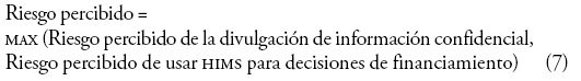 Dos tipos de riesgo diferentes se asociaron con el proyecto: el riesgo de divulgación de la información confidencial contenida en el proyecto y el riesgo de usar la información del HIMS en el proceso de financiación. La percepción del riesgo se formula de la misma manera que la percepción de la conveniencia del proyecto. La percepción total del riesgo se anota en la ecuación 7, asumiendo que el mayor de dos riesgos percibidos dominará la percepción total del riesgo.